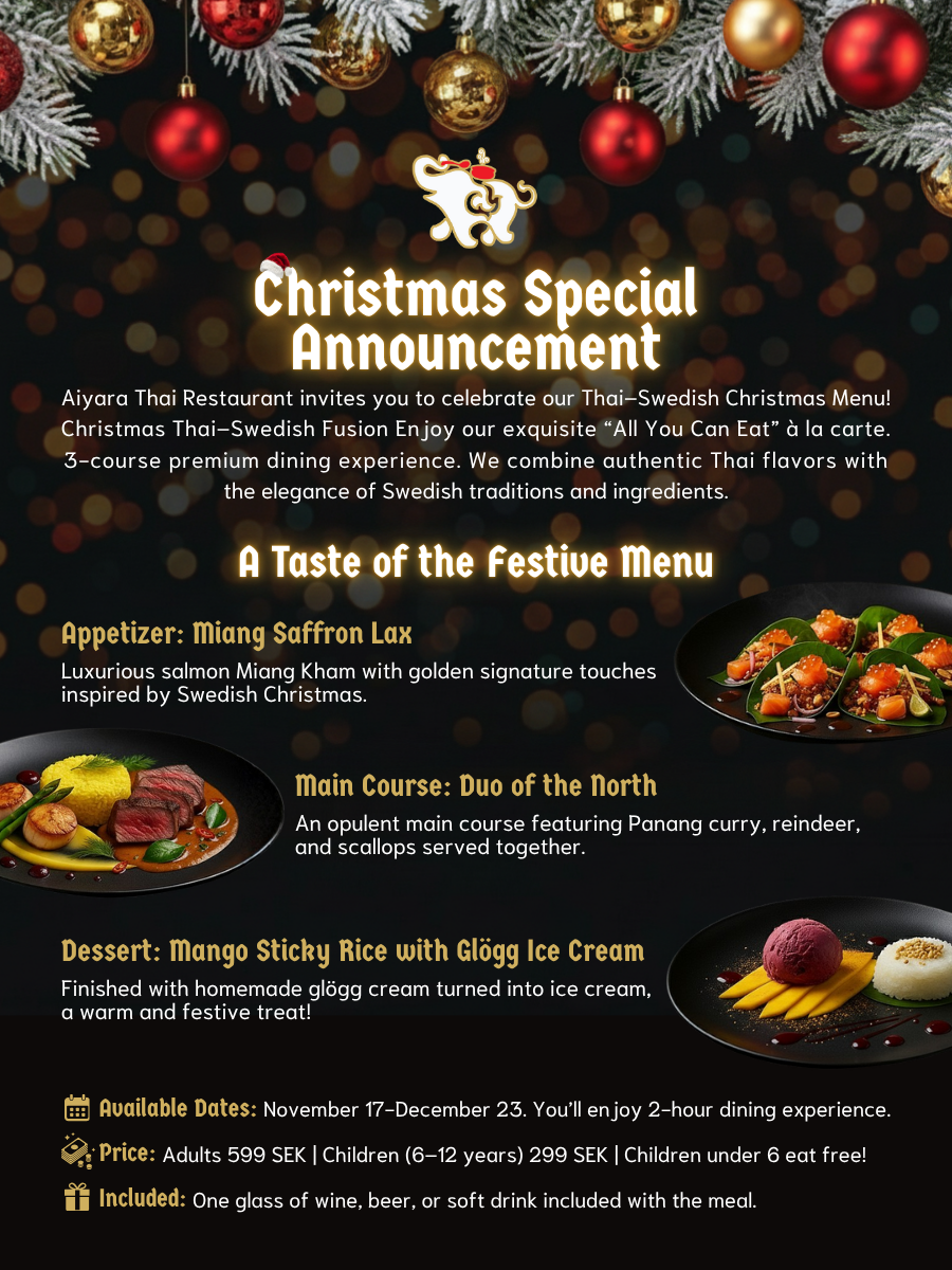 Ranked No. 1 Thai restaurant in Stockholm & No. 2 in all of Sweden and proudly listed on the ViaMichelin map, we put our heart and soul into serving guests a wide variety of real, authentic Thai dishes. With a strong commitment to warm hospitality, every meal is crafted by highly skilled chefs with true passion. Come discover the flavors of authentic Thai cuisine at Aiyara Restaurang.